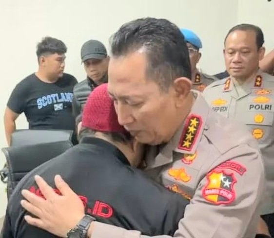 Kapolri tiba di RSCM kemudian disambut keluarga korban. Bahkan, Kapolri langsung memeluk ayah driver ojol tersebut. Kapolri dan pihak keluarga tak bisa menutupi kesedihan.