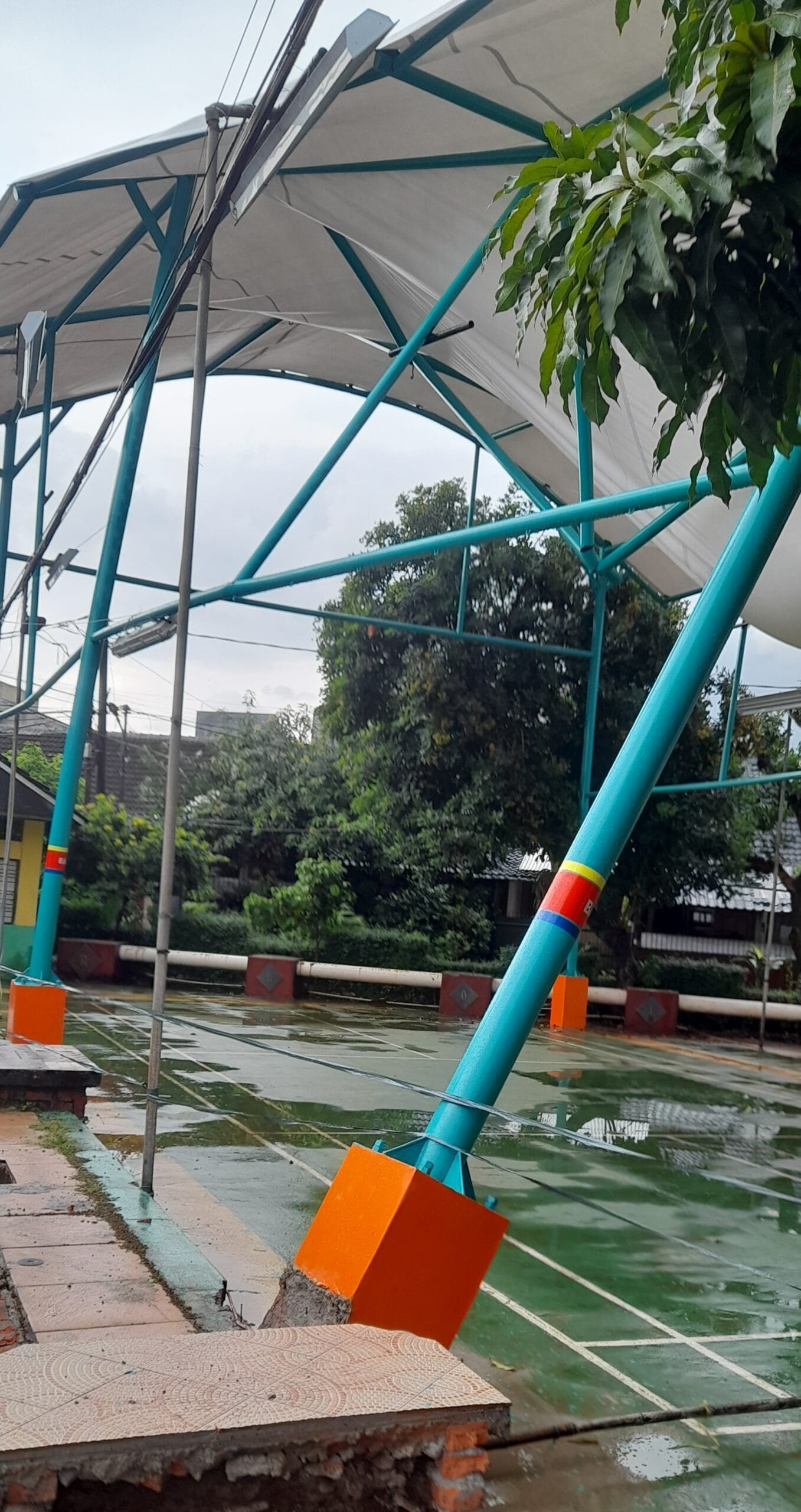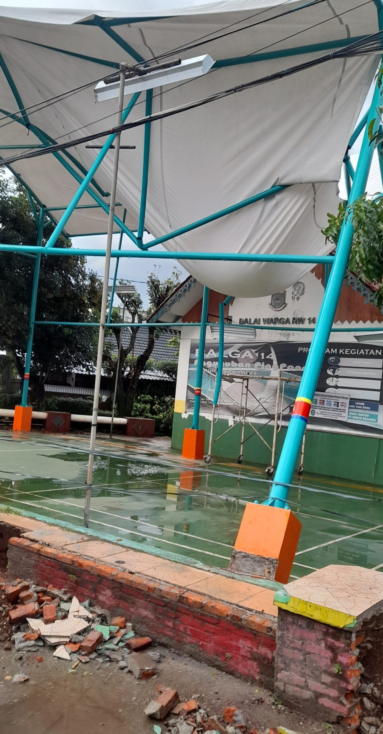 PAMULANG-Fasilitas sarana olah raga di balai warga Rw 014, Kelurahan Pamulang Barat, Kota Tangerang Selatan, Provinsi Banten, Senin sore (6/1/2025) nyaris roboh diterjang hujan deras.