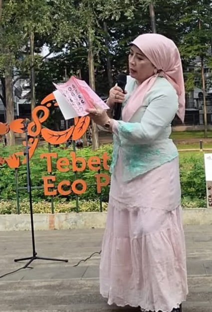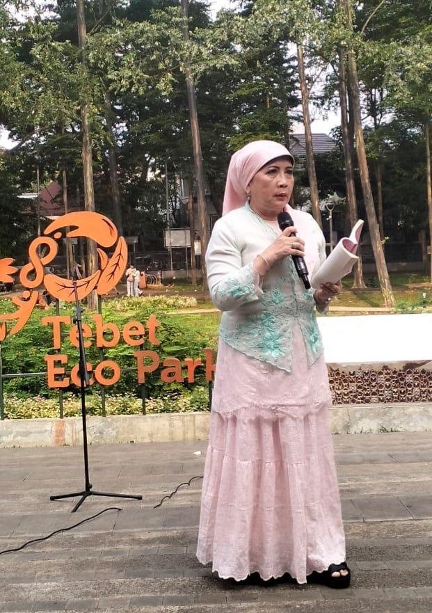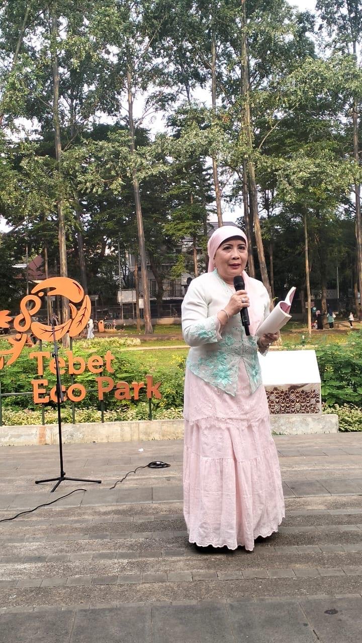 JAKARTA– Ketua Komunitas Obor Sastra Halimah Munawir- sosok penyair dan pengusaha kartini masa kini -tampil dengan anggun, dan berkelas sastra saat baca puisi berjudul “Pena Kartini” pada Minggu sore (27/4/2025) di Tebet Eco Park, sebuah taman hijau ruang terbuka publik yang sejuk, asri dan jauh dari kebisingan Kota Jakarta.
