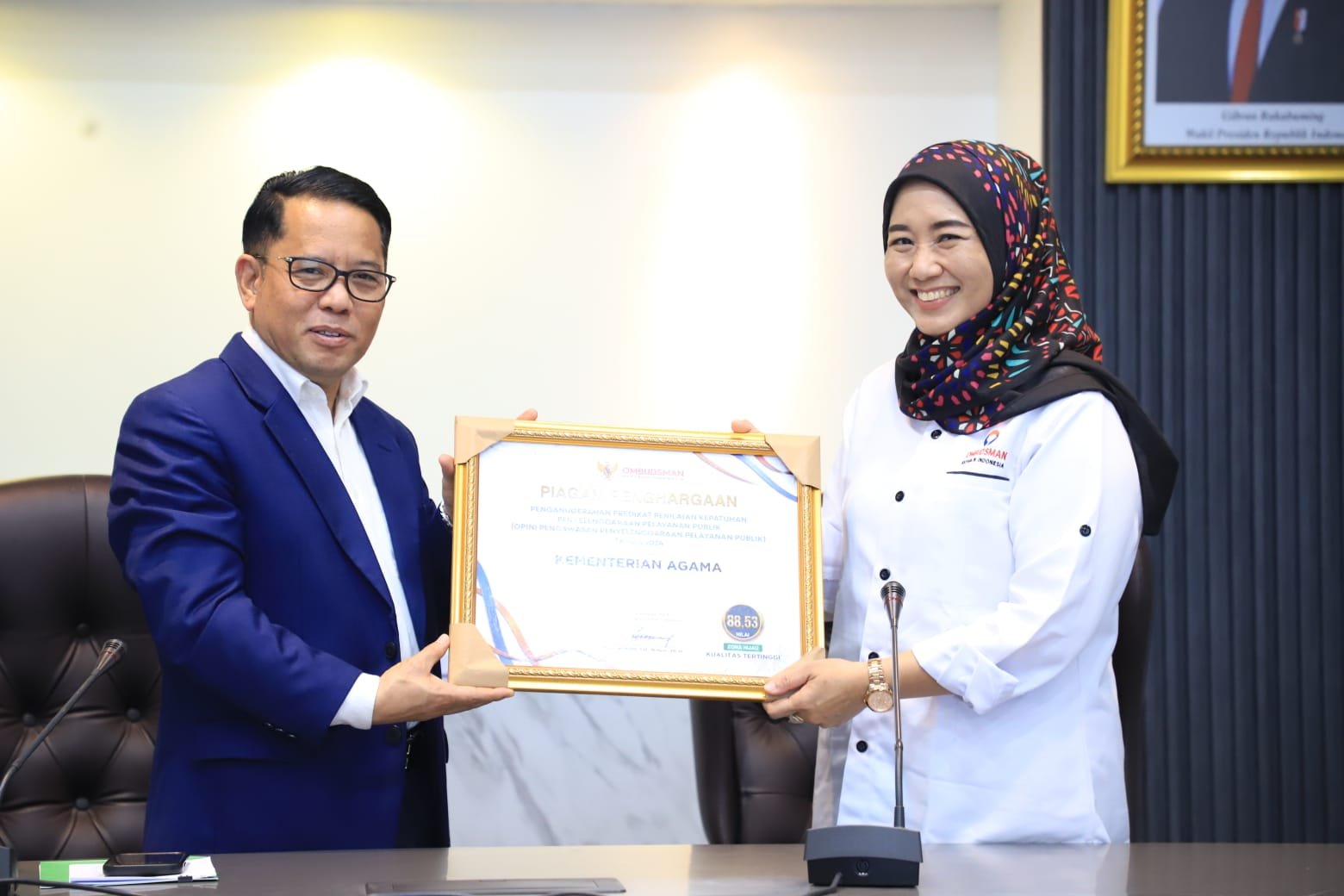 Penghargaan ini diberikan Kepala Keasistenan Manajemen Pengetahuan Ombudsman RI, Aat Sugihartati kepada Sekretaris Jenderal Kemenag RI, Kamaruddin Amin di Kantor Pusat kemenag RI, Jakarta, pada Senin (28/4/2025)