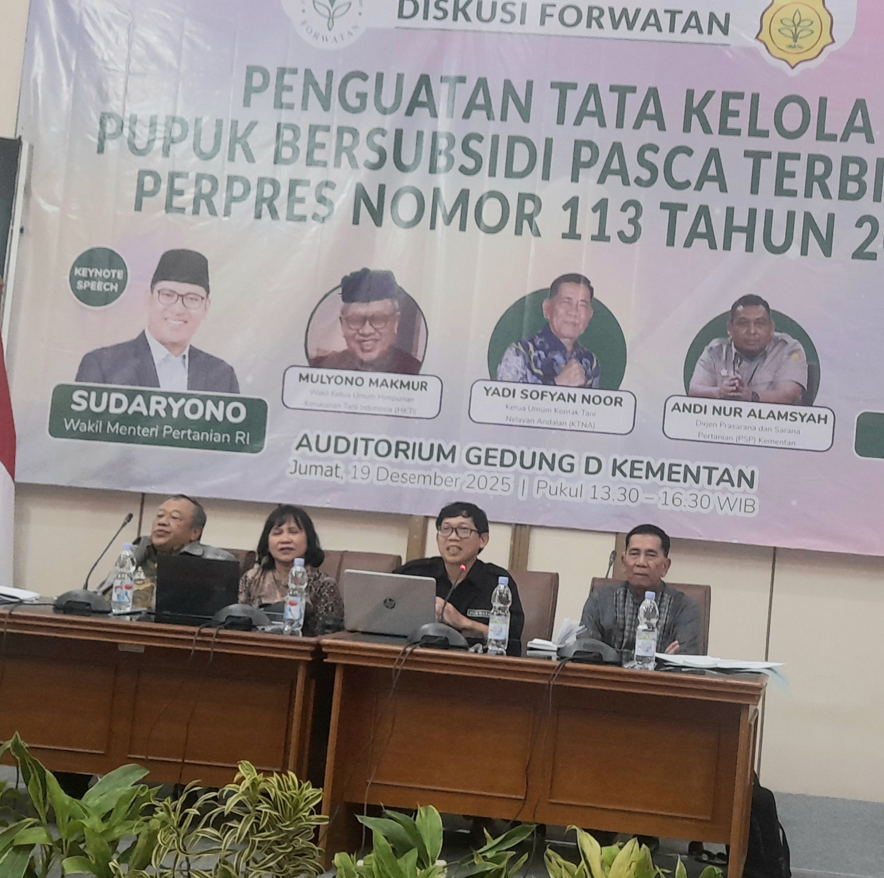 Dalam acara diskusi Forum Wartawan Pertanian (Forwatan) bertemakan “Penguatan Tata Kelola Pupuk Bersubsidi Pasca Terbitnya Perpres Nomor 113 tahun 2025” yang berlangsung di Gedung D, Kantor Pusat Kementerian Pertanian di Jakarta, Jumat siang (19/12/2025).