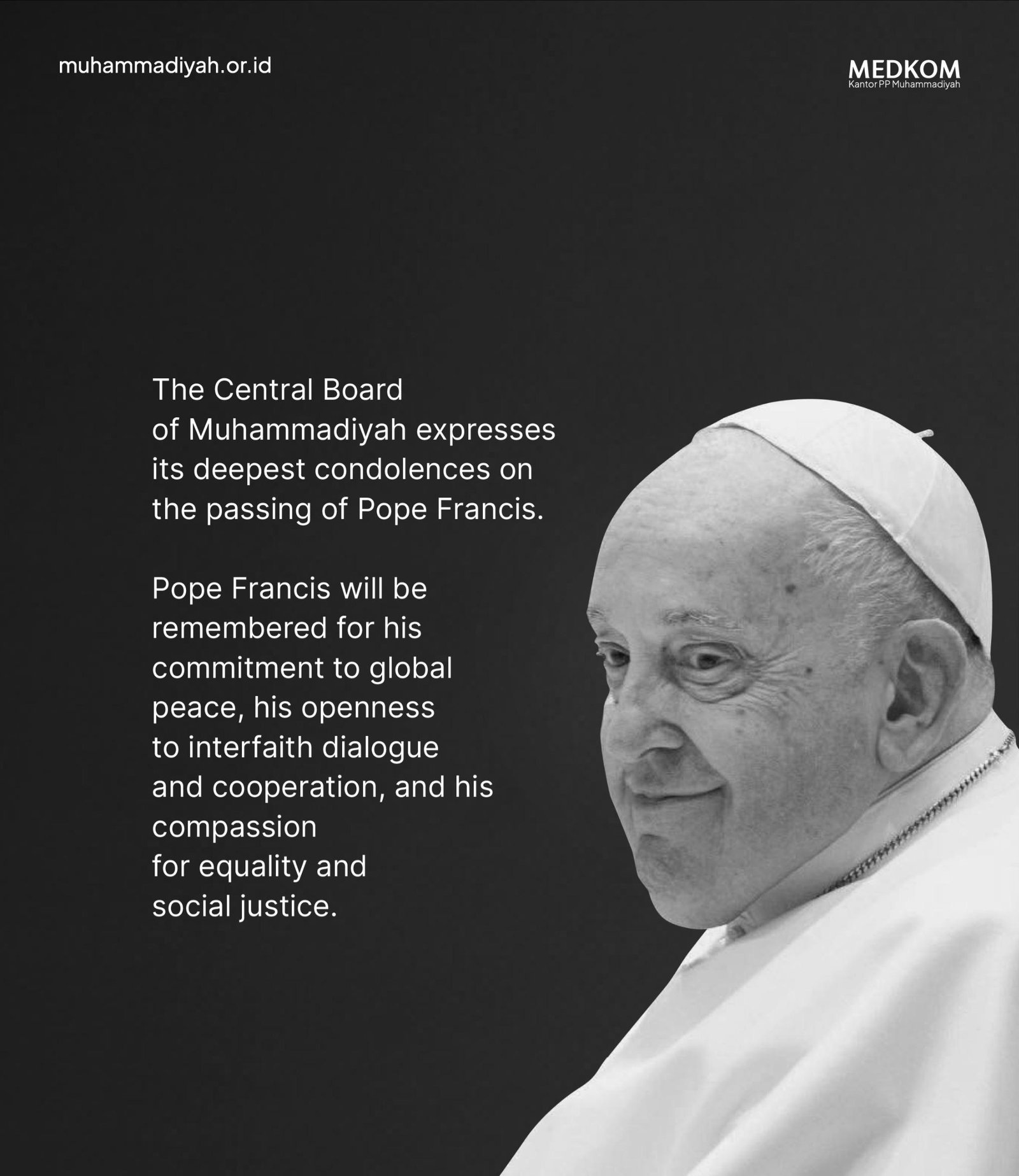 JAKARTA-Pimpinan Pusat Muhammadiyah turut menyampaikan belasungkawa atas meninggalnya Paus Fransiskus pada Senin pagi (21/4) waktu Roma Vatikan.