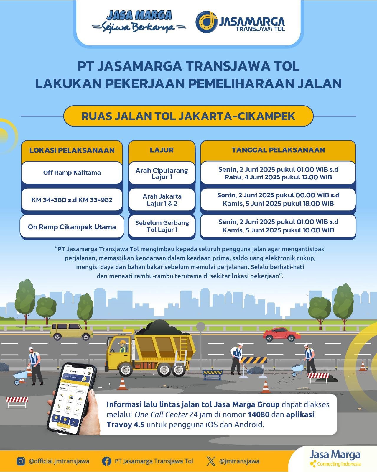 PT Jasamarga Transjawa Tol memohon maaf atas ketidaknyamanan yang ditimbulkan akibat adanya pekerjaan dimaksud dan kami mengimbau kepada seluruh pengguna jalan agar mengantisipasi waktu perjalanan, memastikan kendaraan dalam keadaan prima, saldo uang elektronik cukup, mengisi daya dan bahan bakar sebelum memulai perjalanan.