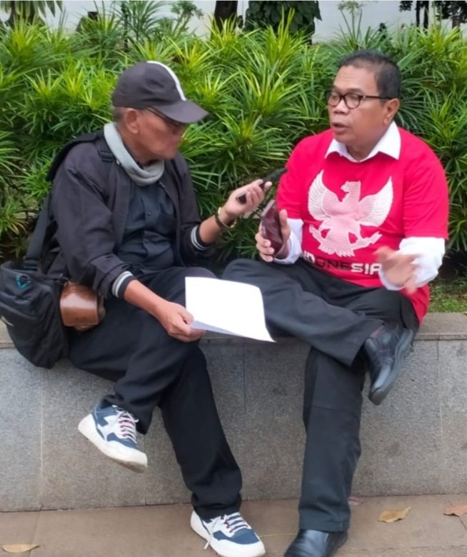 Teks foto : Penyair dan Sastrawan -yang juga Ketua Komunitas Jagat Sastra Milenia (JSM) -Riri Satria sedang diwawancarai oleh Jurnalis Lasman Simanjuntak di area Pusat Kesenian Jakarta (PKJ) Taman Ismail Marzuki (TIM) di Jakarta belum lama ini.(Foto : Ist/dok pribadi)