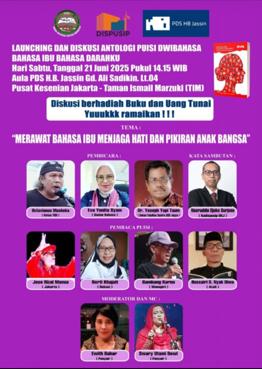 Octavianus Masheka-yang juga dikenal sebagai seorang penyair ini- mengatakan lagi untuk launching dan diskusi buku antologi puisi Dwibahasa “Bahasa Ibu dan Bahasa Darahku ” akan dilaksanakan pada hari Sabtu.tanggal.21 Juni 2025 mulai pukul 14.15 WIB di Aula PDS.HB.Jassin.