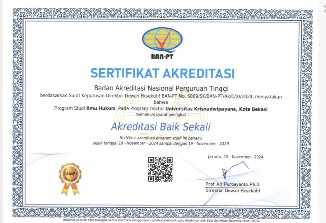 JAKARTA – Universitas Krisnadwipayana (Unkris) kembali membuktikan komitmennya dalam meningkatkan mutu dan kualitas pendidikan, dengan diterimanya sertifikat akreditasi untuk Program Studi Ilmu Hukum pada Program Doktor dari Badan Akreditasi Nasional Perguruan Tinggi (BAN-PT) dengan peringkat akreditasi Baik Sekali. Akreditasi tersebut diterima berdasarkan SK BAN-PT No. 6869/SK/BAN-PT/Ak/D/XI/2024 tertanggal 19 November 2024.
